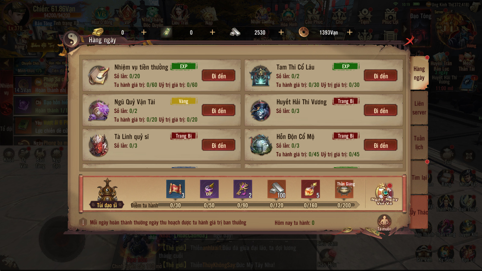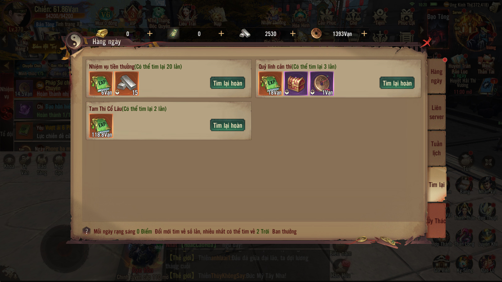 Thợ Săn có thể hoàn thành nhiệm vụ hàng ngày trong hệ thống nhiệm vụ để nhận EXP thăng cấp nhanh . Tiên Hữu hãy nhìn góc trái sẽ thấy bản hệ thống nhiệm vụ, ngoài ra Thợ Săn có thể xem lịch sự kiện ở mục Tuần Lịch