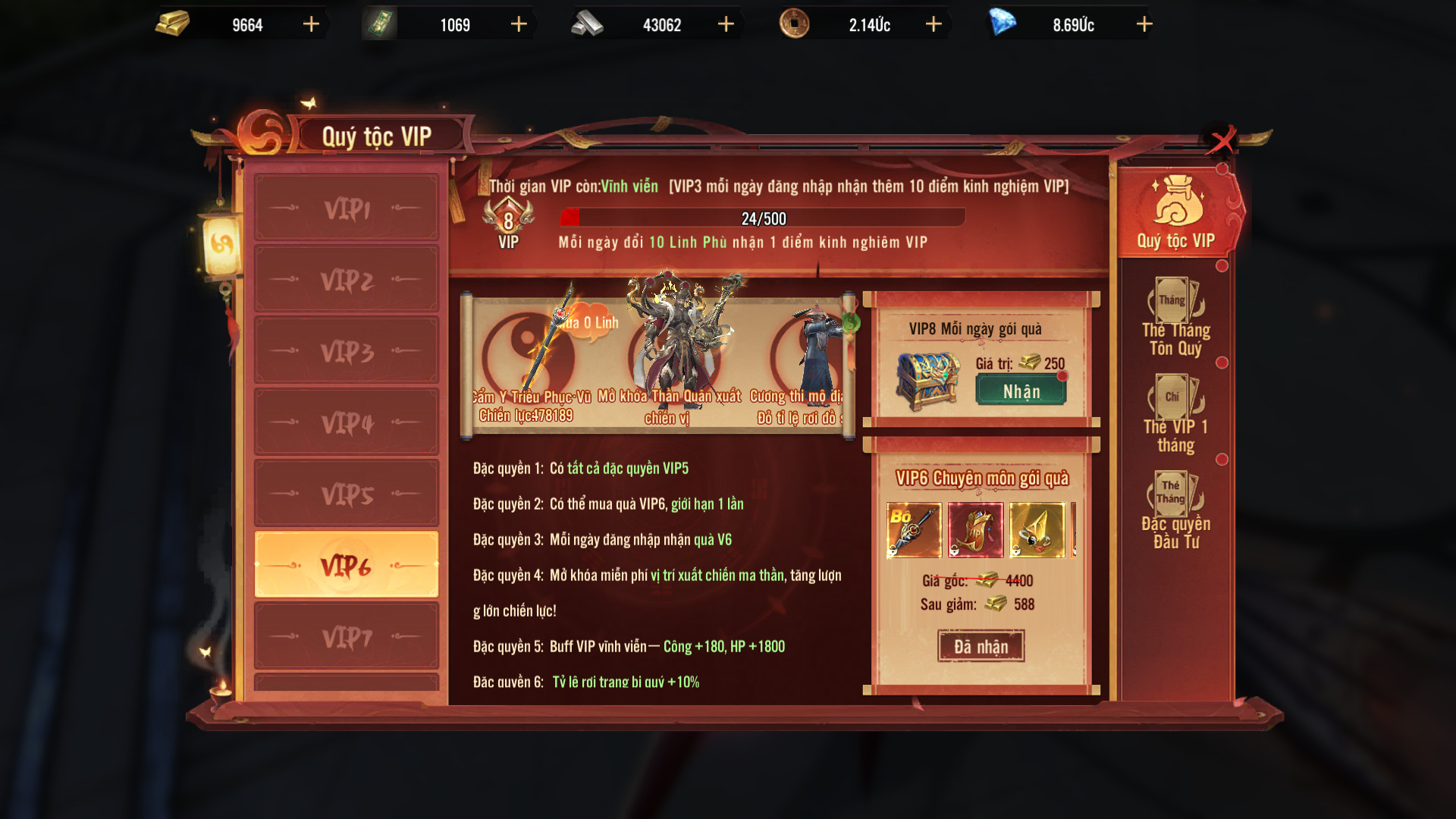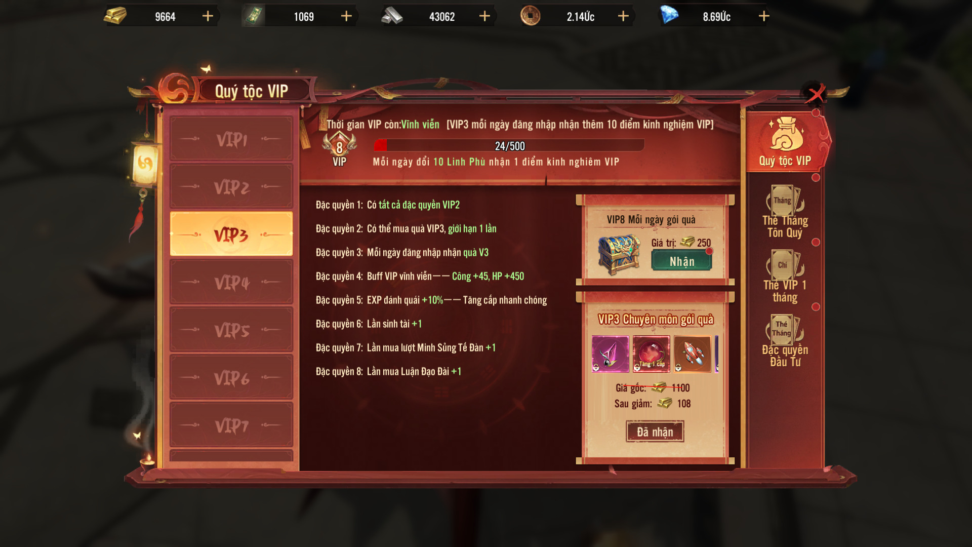 - VIP 3 mỗi ngày đăng nhập nhận thêm 10 điểm kinh nghiệm VIP, dùng 10 linh phù nhận 1 điểm kinh nghiệm VIP