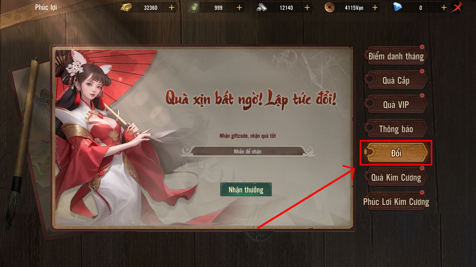 🔹 Bước 3: Nhập mã CODE và bấm "Nhận thưởng"