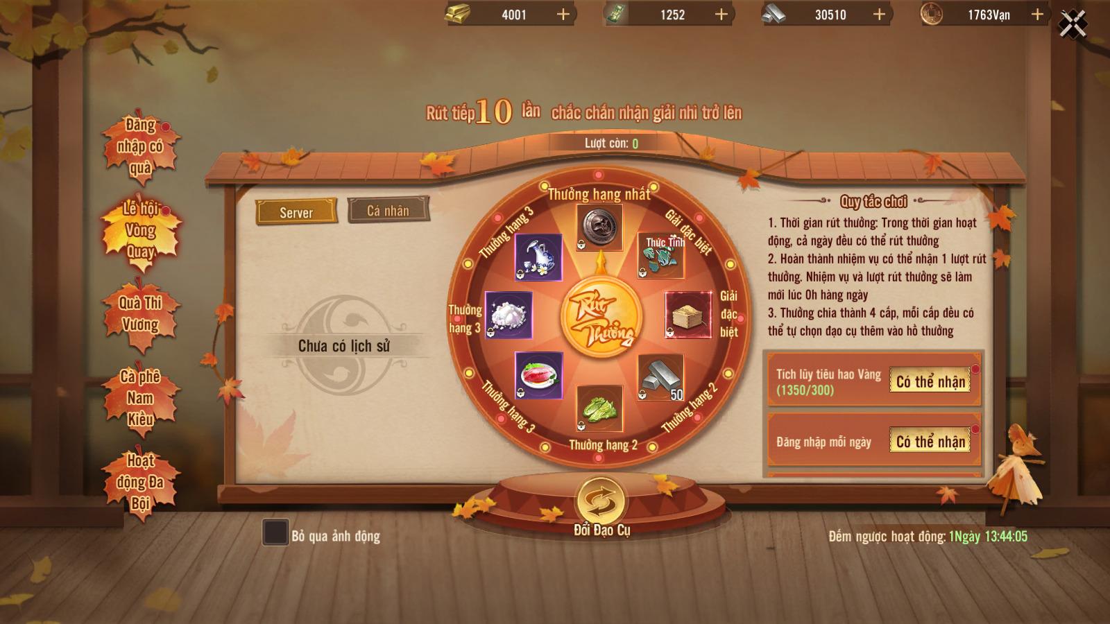 Hoàn thành nhiệm vụ có thể nhận 1 lượt rút thưởng. Nhiệm vụ và lượt rút thưởng sẽ làm mới lúc 0h hàng ngày