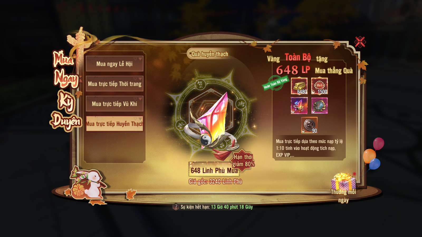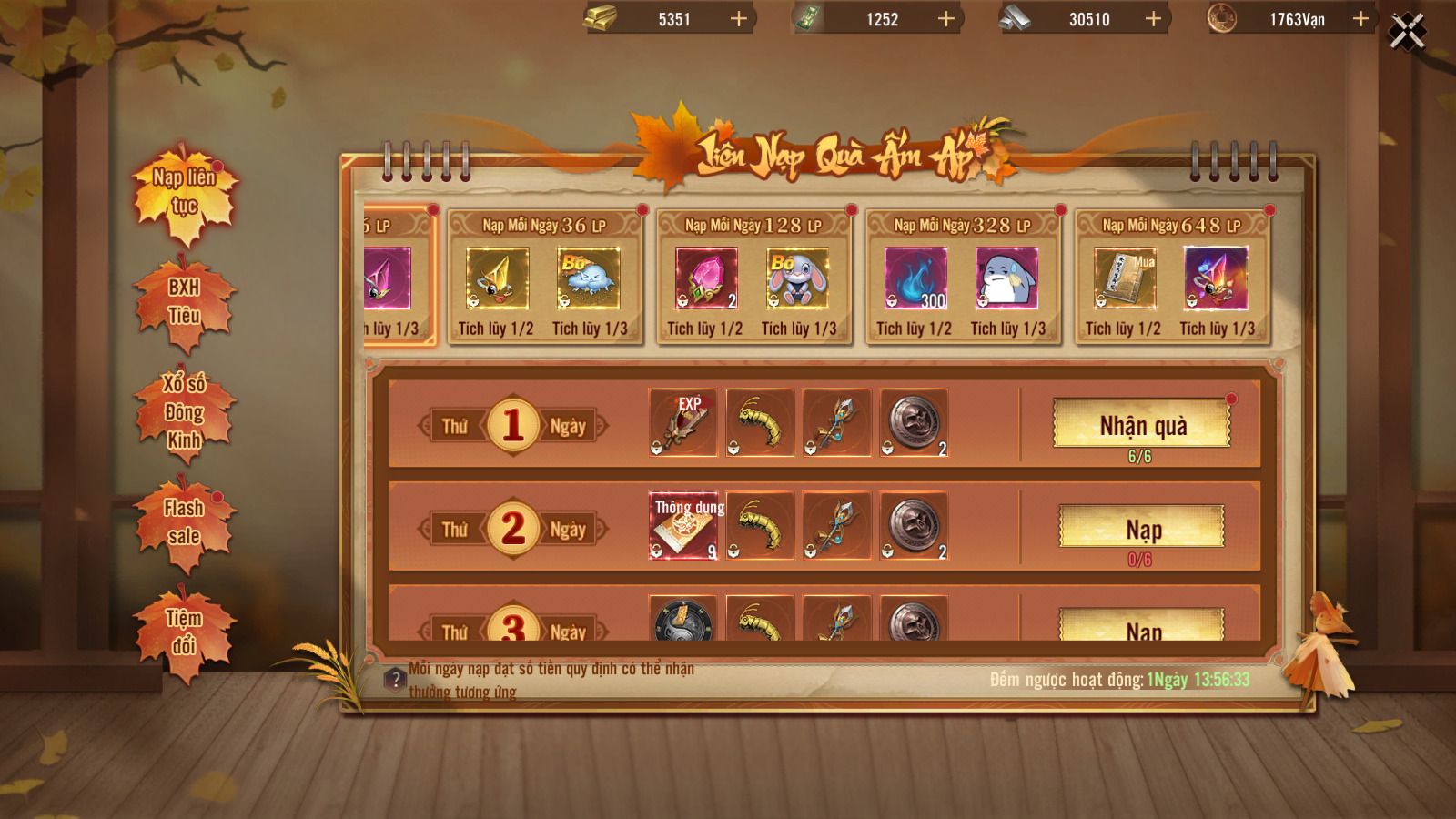 Nạp đúng mốc 6LP, 36LP, 128LP, 328LP, 648LP (tích lũy 2 & 3 ngày) nhận các phần quà giá trị: