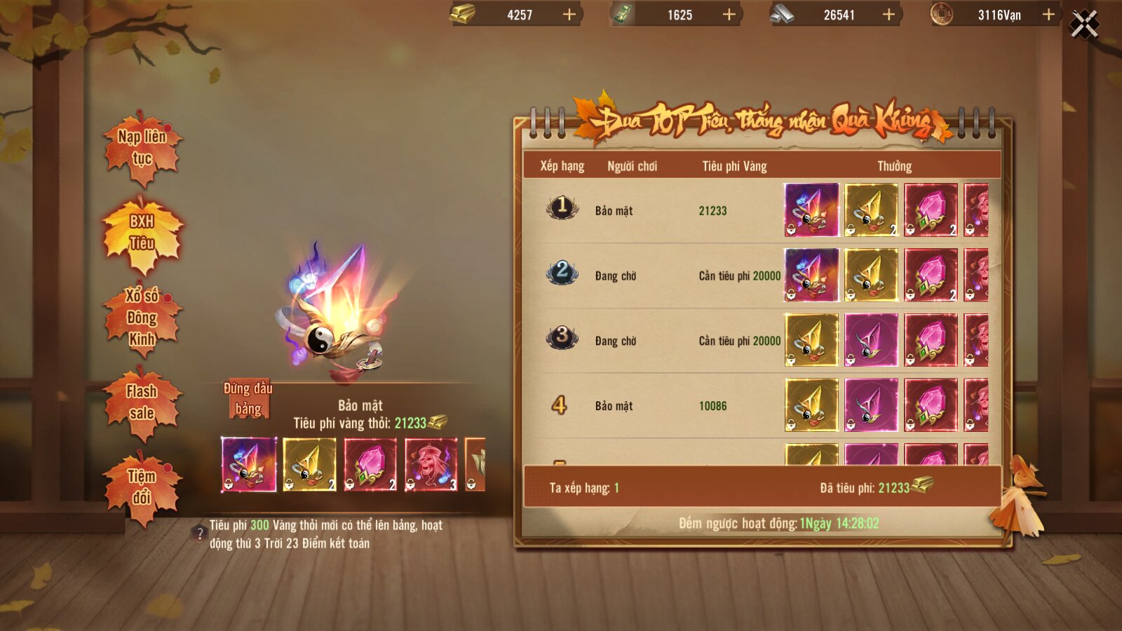 Tiêu số lượng vàng đạt điều kiện có thể vào top, tổng kết lúc 23h, tiêu vàng nhận từ đấu giá không tính vào bảng xếp hạng