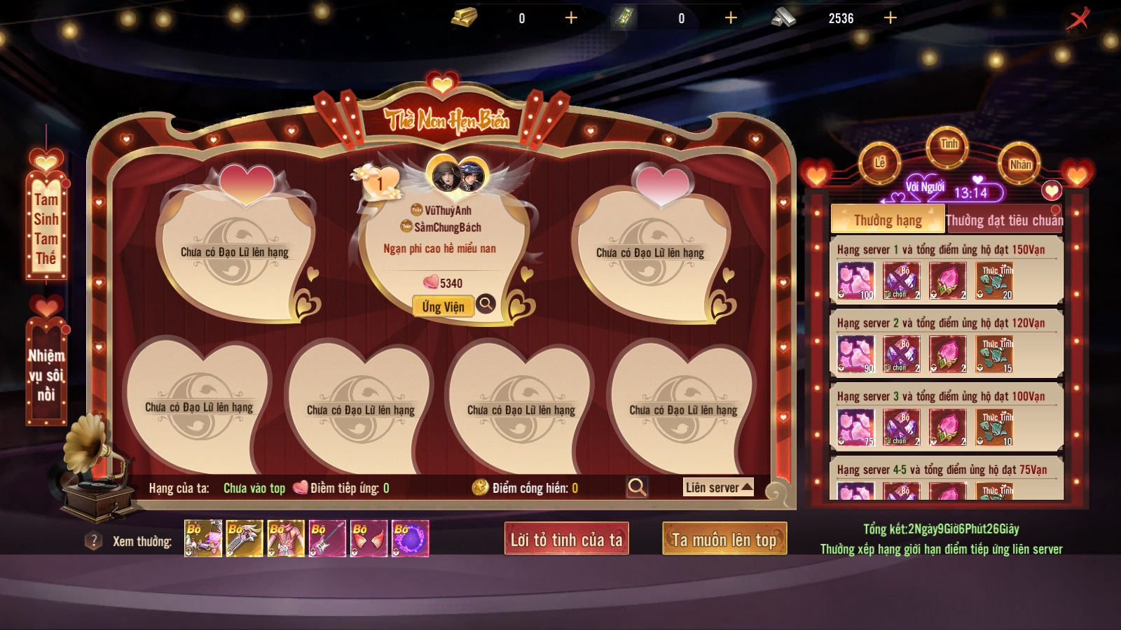 3. Khi điểm tiếp ứng cùng đạo lữ đạt điều kiện sẽ lên bảng xếp hạng. Khi tổng kết hoạt động duy trì hạng và điểm tiếp ứng đạt điều kiện sẽ nhận thưởng.