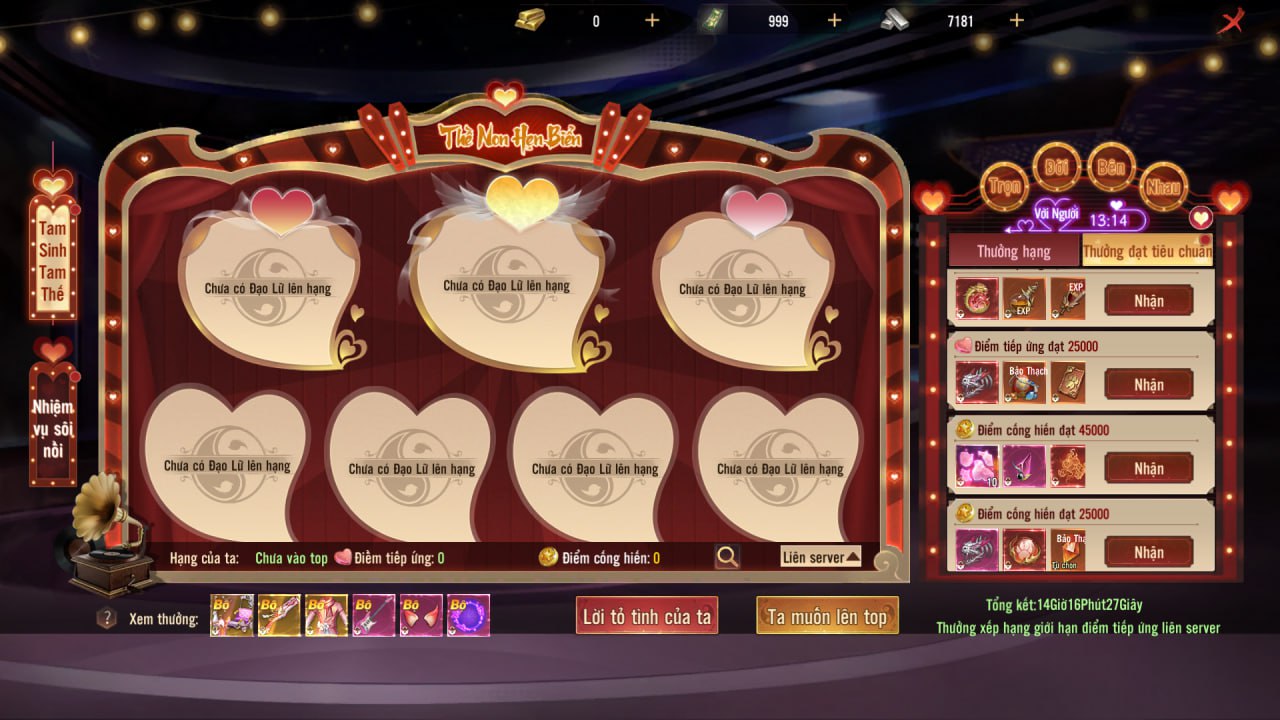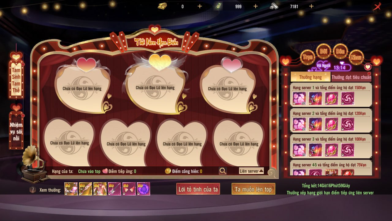 3. Khi điểm tiếp ứng cùng đạo lữ đạt điều kiện sẽ lên bảng xếp hạng. Khi tổng kết hoạt động duy trì hạng và điểm tiếp ứng đạt điều kiện sẽ nhận thưởng.