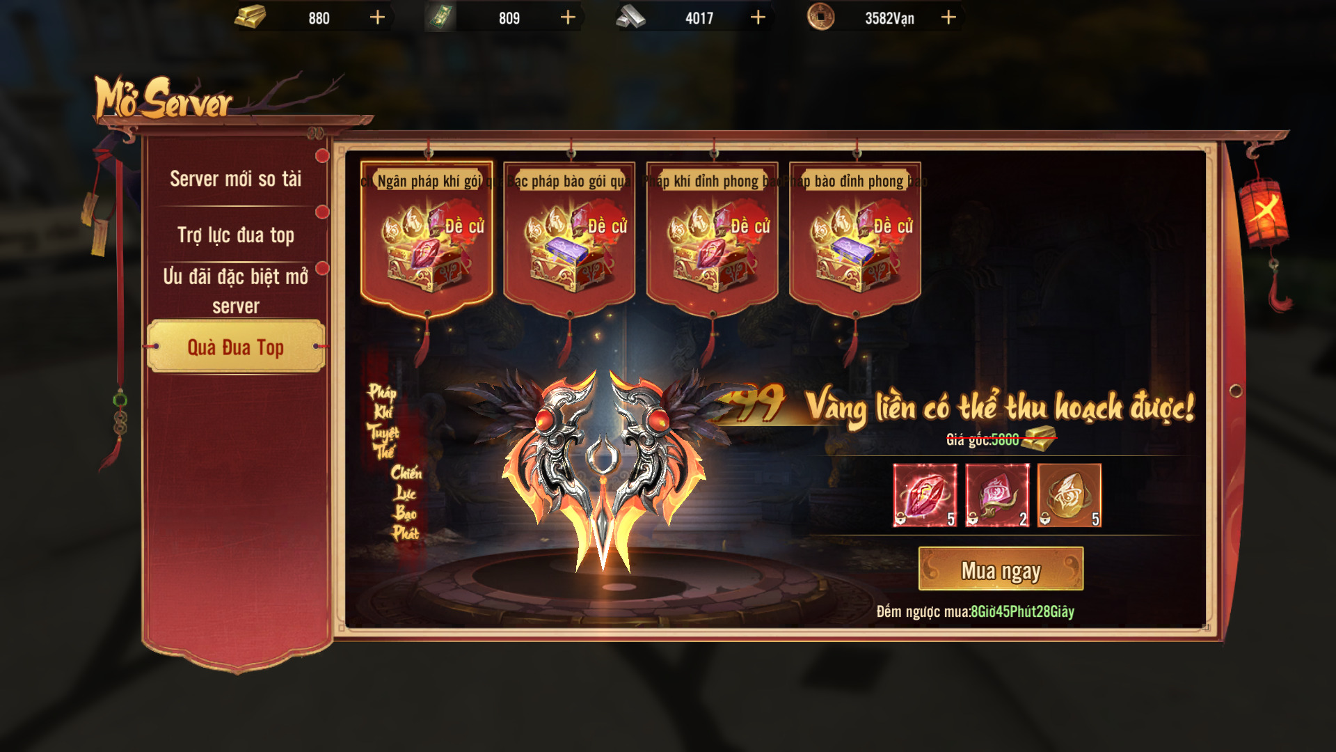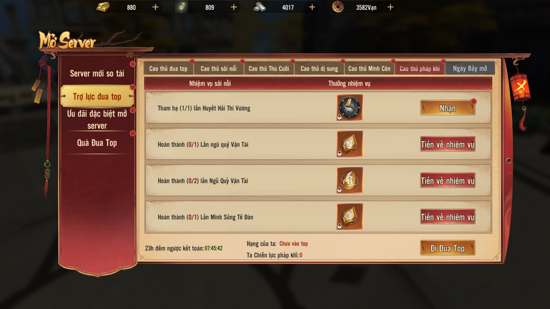Nâng cấp Pháp Khí, Pháp Khí lực chiến càng cao xếp hàng càng cao. top 1-3 sẽ nhận được nhiều phần thưởng giá trị